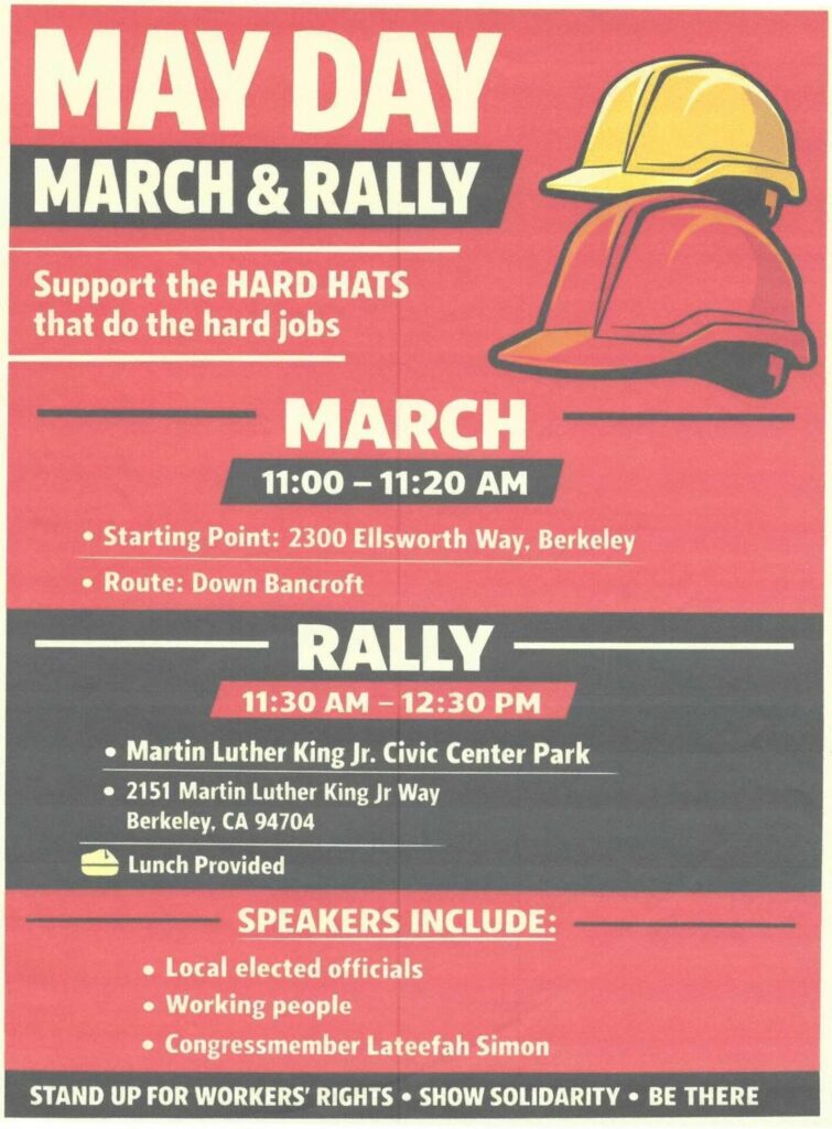 On May 1st at 11:00 am the Alameda Building Trades and District Council 16 Eastbay Locals will be participating in a March and Rally to show solidarity and stand up for workers’ rights, I’m asking that we get as many people as possible to support all our Brothers and Sisters not just in our Union but all Unions that do the jobs we do! There will be guest speakers and Lunch will be provided, I hope to see you there!